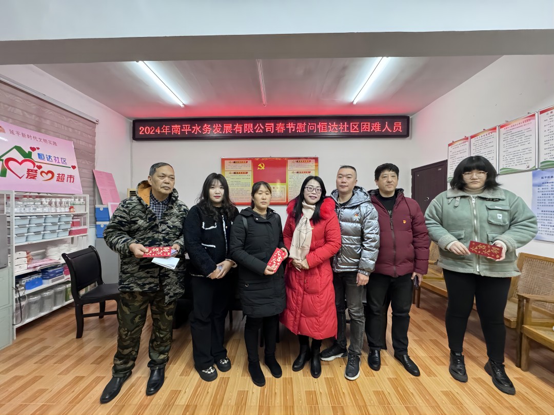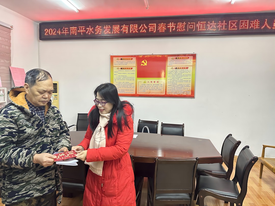為深入貫徹落實習近平新時代中國特色社會主義思想和黨的二十大精神,持續(xù)深化“在職黨員進社區(qū)、服務(wù)群眾做貢獻”主題實踐活動。南平水務(wù)發(fā)展有限公司充分發(fā)揮共駐共建單位黨員服務(wù)群眾作用,情系困難群眾。1月30日,南平水務(wù)第二黨支部書記、副總經(jīng)理康志萍、第一黨支部紀檢委員陳聯(lián)輝和第二黨支部紀檢委員連成鋼,到共駐共建單位紫云街道恒達社區(qū)慰問社區(qū)困難群眾,并為他們送上了南水黨支部節(jié)日的慰問和新春的祝福。